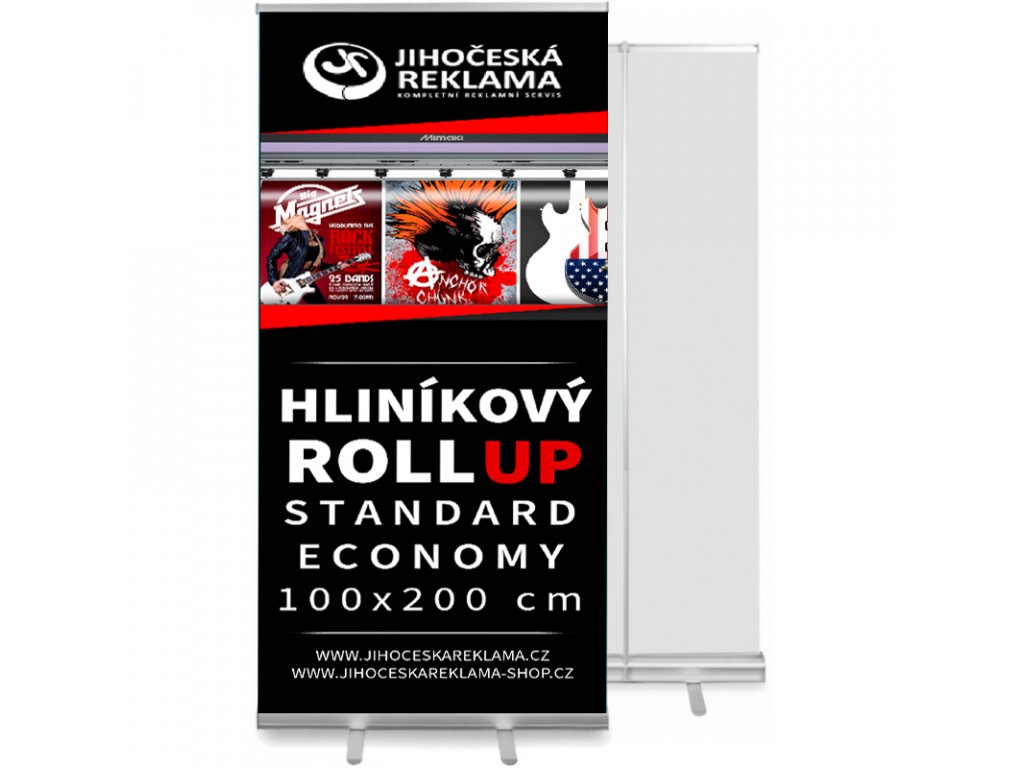• Kvalita - Roll-up standard economy je vyrobený z vysoko kvalitného hliníka, ktorý je odolný proti poškodeniu a deformácii. Potlač je vykonaná na prémiovom filme, ktorý má vysokú ostrosť a živé farby. Grafika je chránená proti poškriabaniu a slnečnému žiareniu tým, že sa roluje do základne. Ako materiál používame Blockout premium 330g so šedou zadnou stranou.